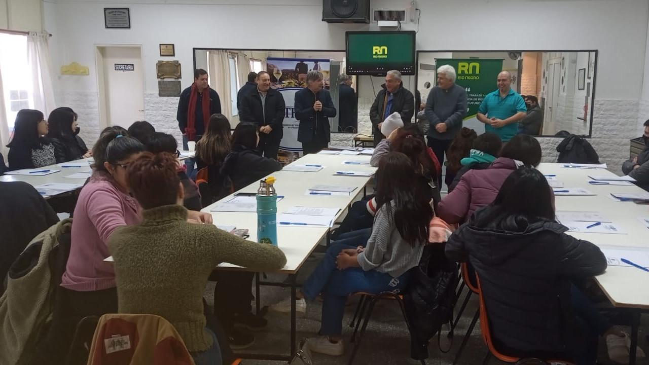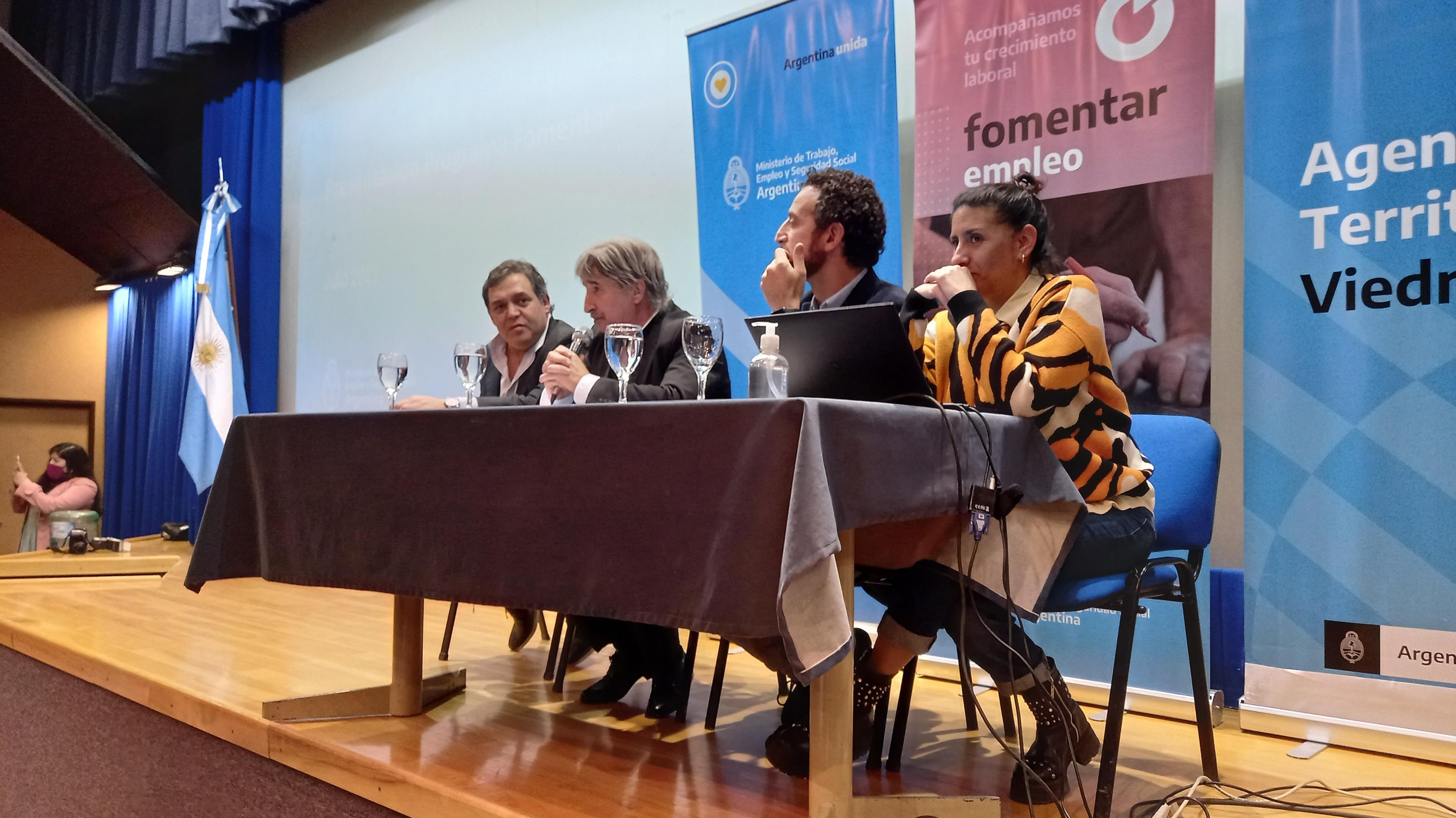 En el microcine del CURZA, el Ministro Stopiello participó junto al jefe de Gabinete del Ministerio de Trabajo, Empleo y Seguridad Social de la Nación, Roberto Sukerman y el jefe Territorial de Viedma del mismo organismo nacional, Fernando Fuentes, del lanzamiento en Río Negro del Programa Fomentar Empleo, que se trabajará en conjunto entre Nación, Provincia y los municipios.